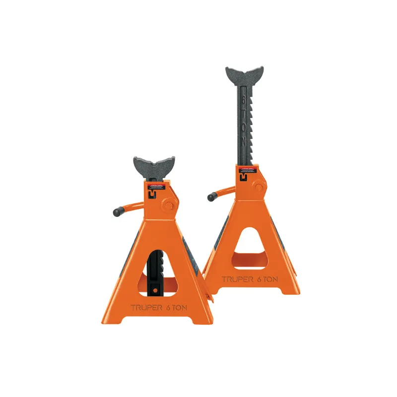 Juego de 2 torres para auto Truper de 3 t, 6 t o 12 t, con asiento antideslizante y ajuste rápido. Elevación segura y profesional para talleres y garajes.