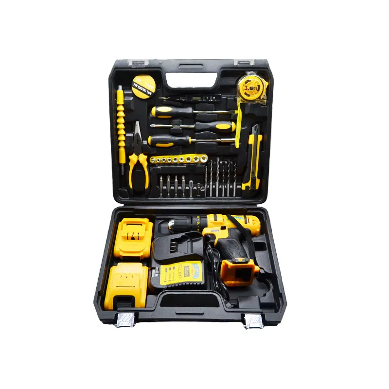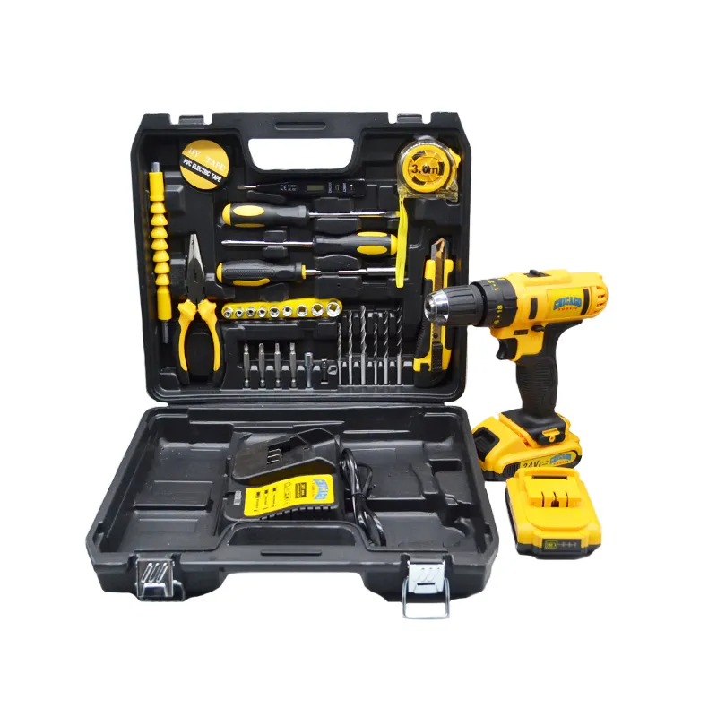 Kit de herramientas de 33 piezas con taladro de 24V, baterías recargables y accesorios esenciales para trabajos eléctricos, mantenimiento y bricolaje, todo en un maletín organizado.
