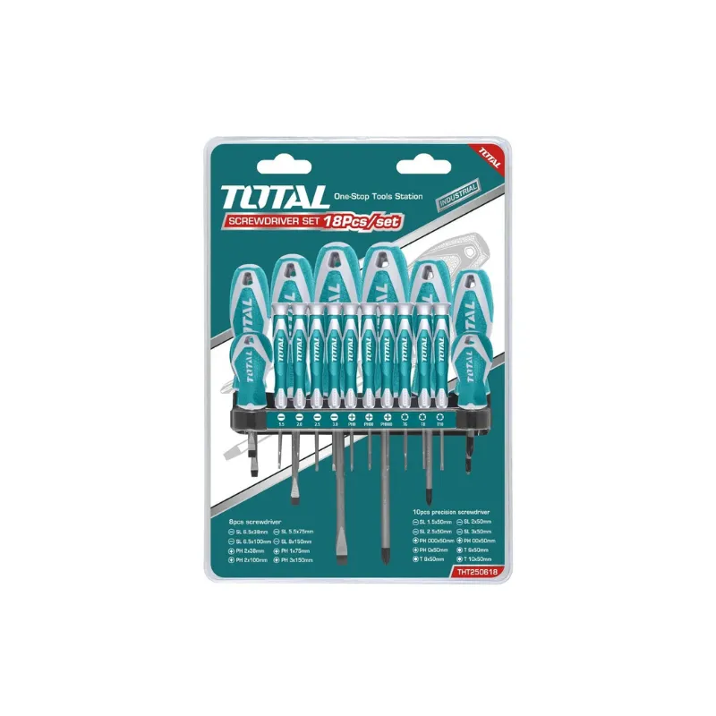 - Con este juego de destornilladores de 18 piezas tendrás un set completo con muchas medidas para muchos tamaños de tornillos. Con más de 10 tamaños diferentes y con puntas de pala, estrella y torx, así podrás apretar o aflojar varios tornillos con diferentes cabezas.