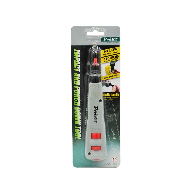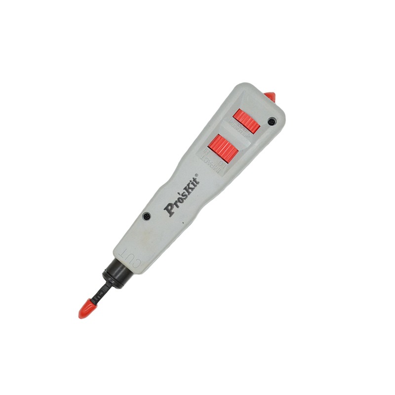 Ponchadora de impacto Proskit CP-3151 diseñada para trabajar con cables de categoría hasta Cat 6. Fabricada en ABS y acero 40Cr, incluye ajuste de fuerza, mango antideslizante y espacio para almacenar cuchillas de repuesto, garantizando precisión y seguridad en cada instalación.